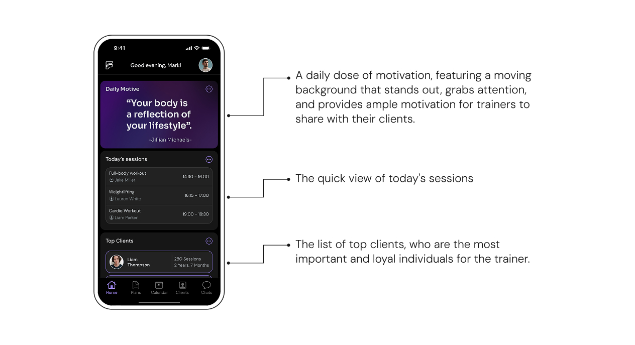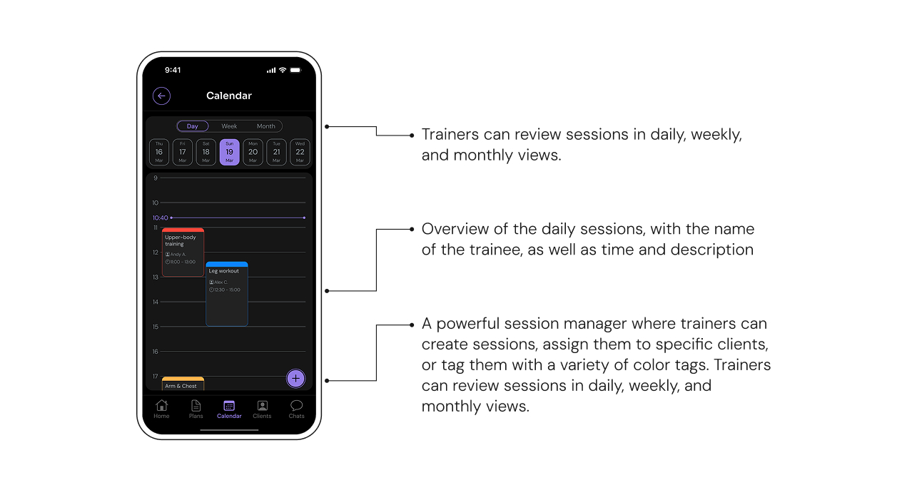 The app was designed in dark mode, since many personal trainers work in gym environments with dim or low lighting. Dark mode reduces screen glare and minimizes eye strain, providing a more comfortable and visually pleasing experience for users during training sessions.