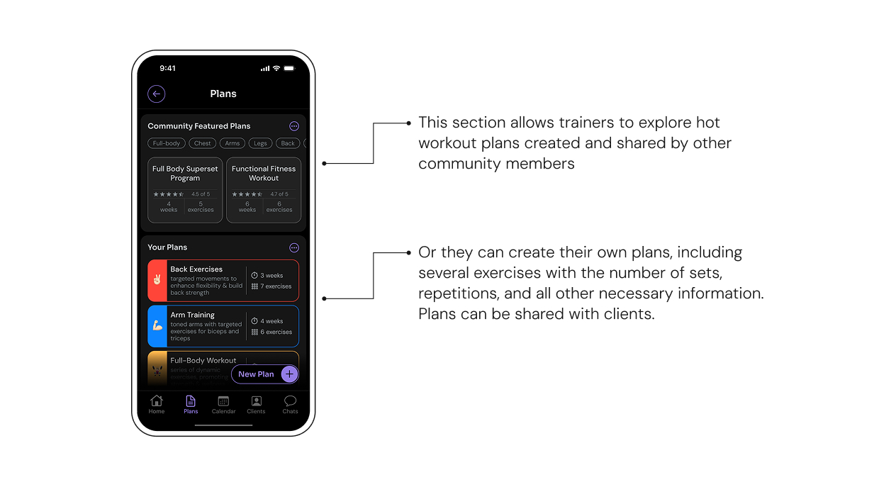 FitPlan provides a mobile-centric solution that empowers trainers to seamlessly manage their workflow, track progress, and engage with clients anytime, anywhere. By offering a mobile app accessible on the go, FitPlan ensures trainers have the flexibility and convenience to schedule sessions, track client progress, and communicate with clients in real-time, even within the confines of the gym environment. With FitPlan, personal trainers can break free from the limitations of desktop-based tool.